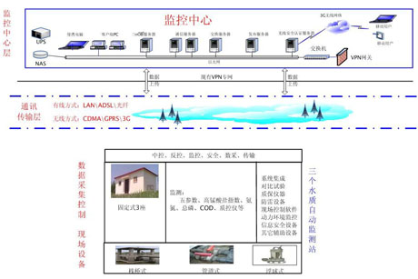 此项目总体架构设计上分为现场数据采集控制层、通讯传输层、监控中心层等三个层次,建设内容包括固定站点建设、远程质控仪系统集成、有线和无线通讯链路建设、地表水监测数据管理控制系统建设等。具备实时监测、超标报警、水质评价、趋势预测、视频监控、信息发布、远程故障诊断、人工智能运维等功能。