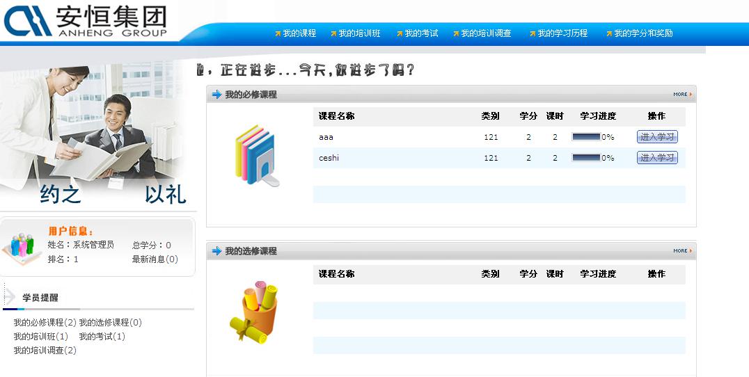 E-learning系统是安恒集团独立搭建并维护运行的内部在线学习平台,它是以互联网平台为支撑、以课程培训为中心、以内部考核紧密相连的完整的在线学习系统。每一个安恒人都可以根据企业内部账号、密码登陆该平台系统,在学习界面进行课程管理,自主安排时间学习公司共享课程和各部指定课程,并能够清楚知晓自己通过培训所获得的学分及奖励。