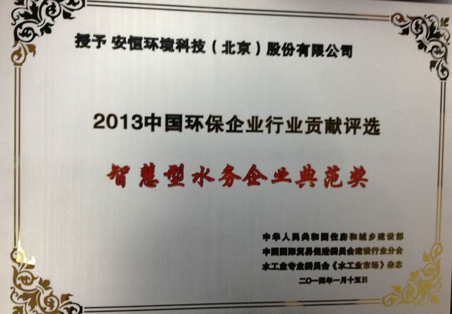 新年伊始捷报传,安恒集团以优异的表现荣获2013中国环保企业贡献盘点评选的“智慧型水务企业典范奖”。